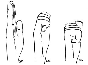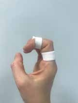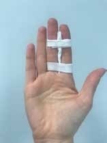 The taping should be applied as in the picture, between the finger creases so you can bend and straighten the joints. You may need to cut your tape in half lengthways to make it narrow enough to stop it from blocking your movement. A piece of soft gauze can be placed between the fingers to absorb any sweat and to stop them from getting sore by rubbing. You can change the taping daily to freshen up your hand. Reapply the taping immediately after you have done this.