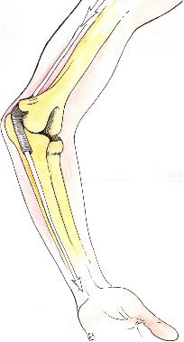 The ulnar nerve classically supplies sensation to the little finger and the outer half of the ring finger. In addition it supplies many of the small muscles in the hand, which are particularly important in the fine movements of the fingers and the thumb. The nerve courses around the inner aspect of the elbow and it is quite close to the surface at this point. In fact when you hit your 'funny bone' it is the ulnar nerve itself that is bashed. The nerve is contained within a tunnel as it comes around the elbow, known as the cubital tunnel. It is vunerable at this point to becoming trapped or inflamed.